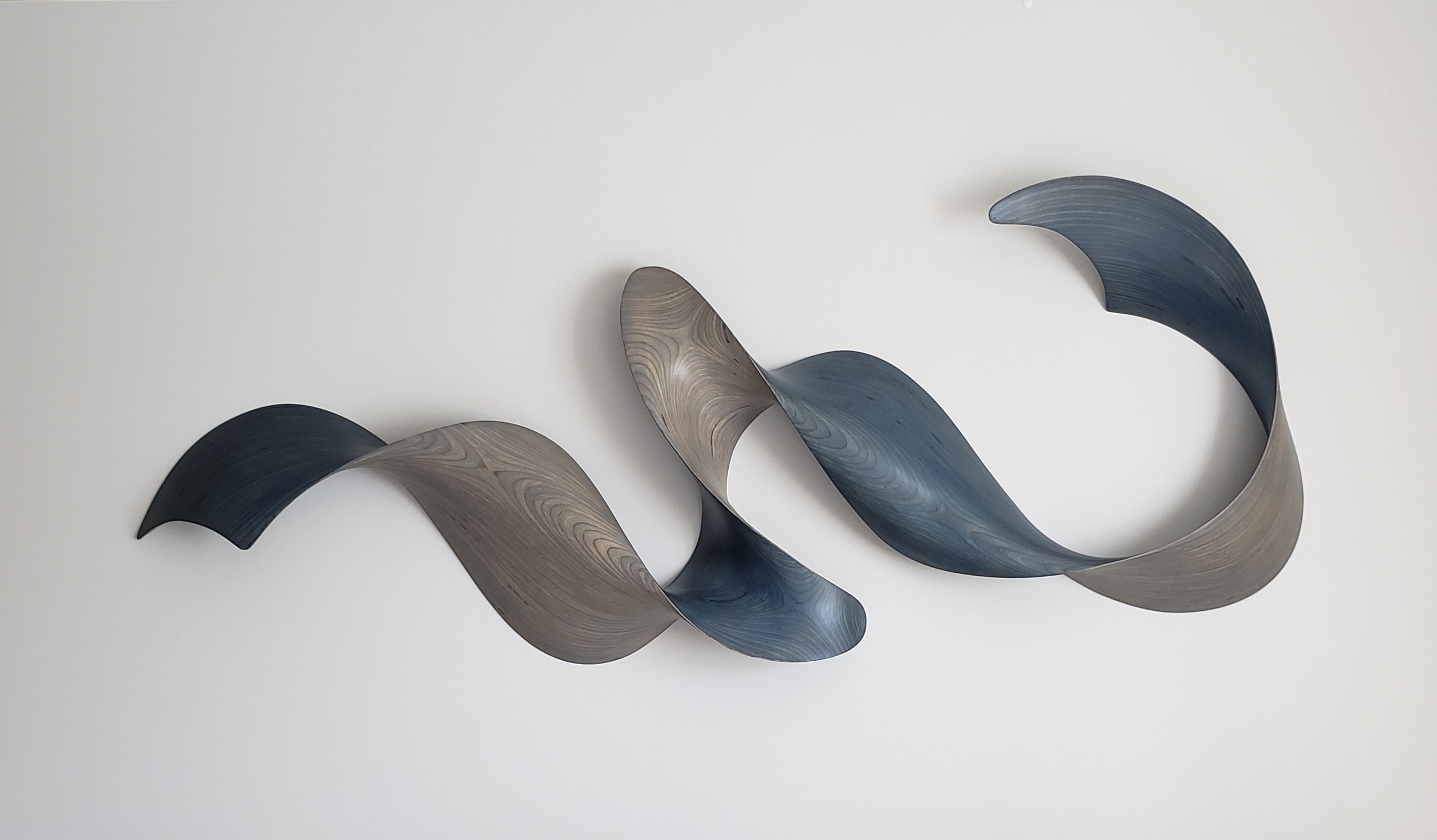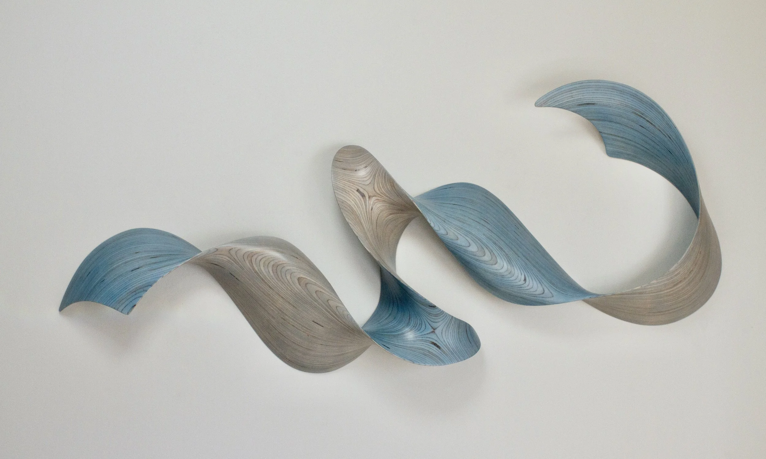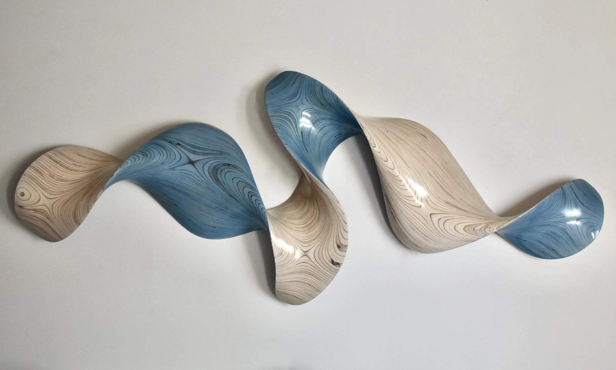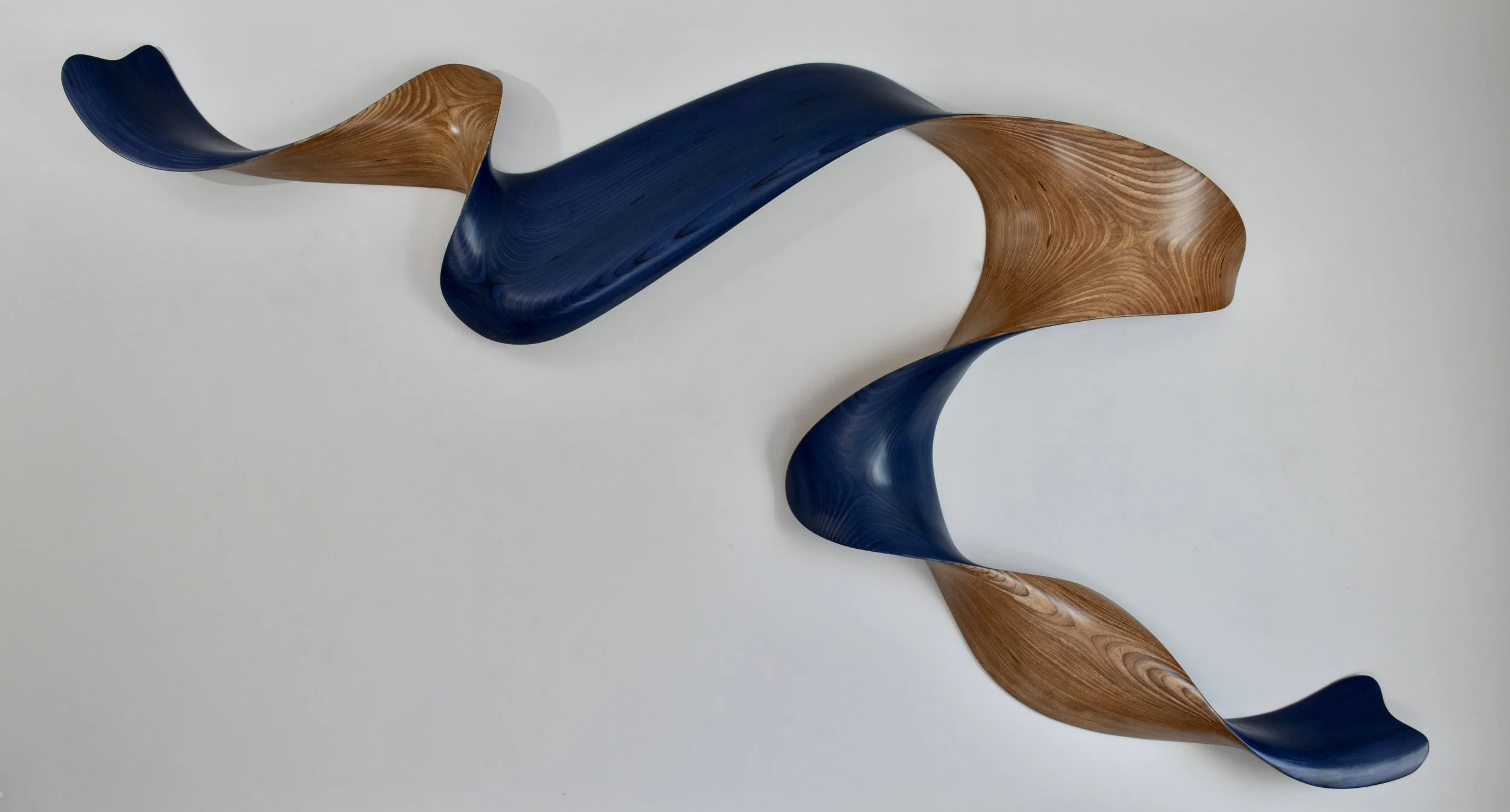 Artistic sculpture of a twisted ribbon shape with wood grain and blue painted sections, mounted on a white wall.