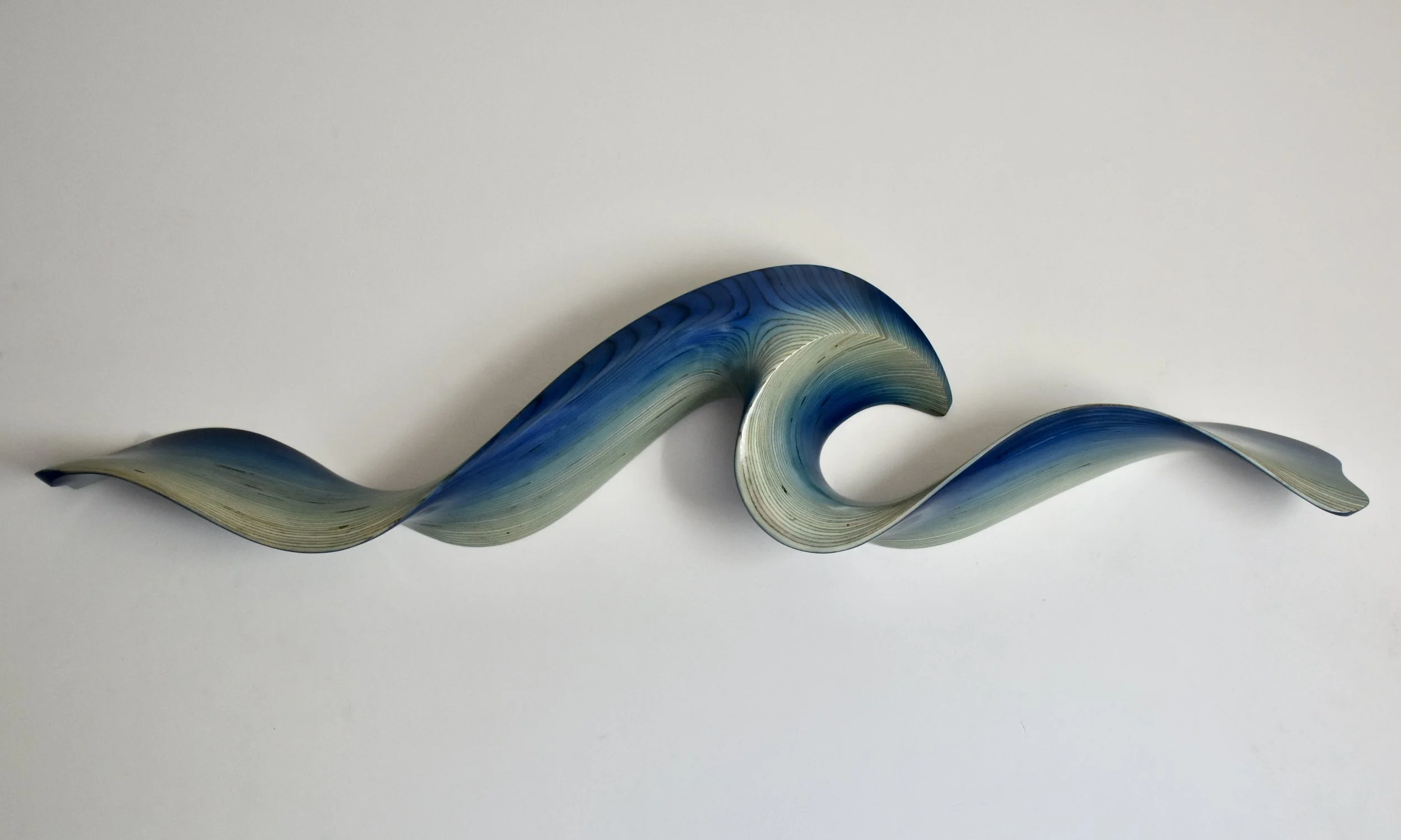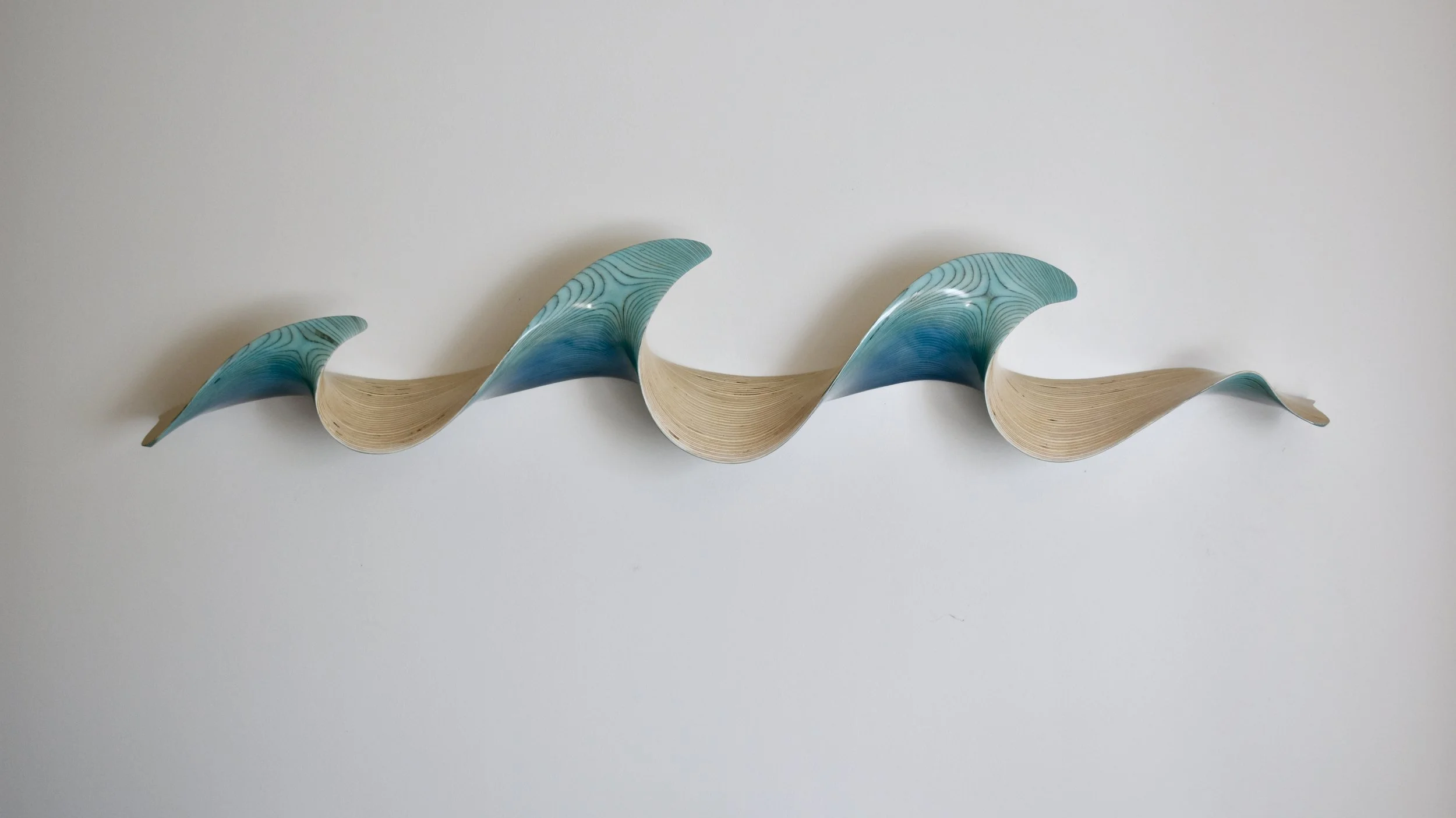 Decorative wall art resembling a wave, made of layered wood with blue and teal painted accents.