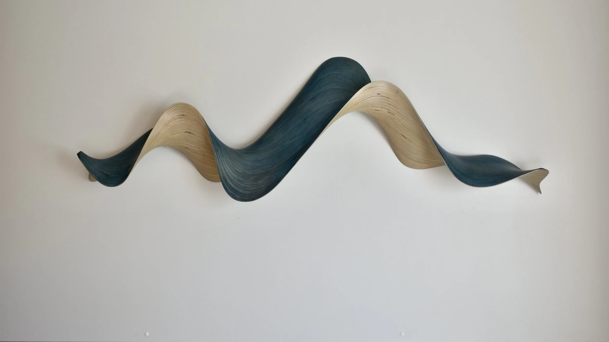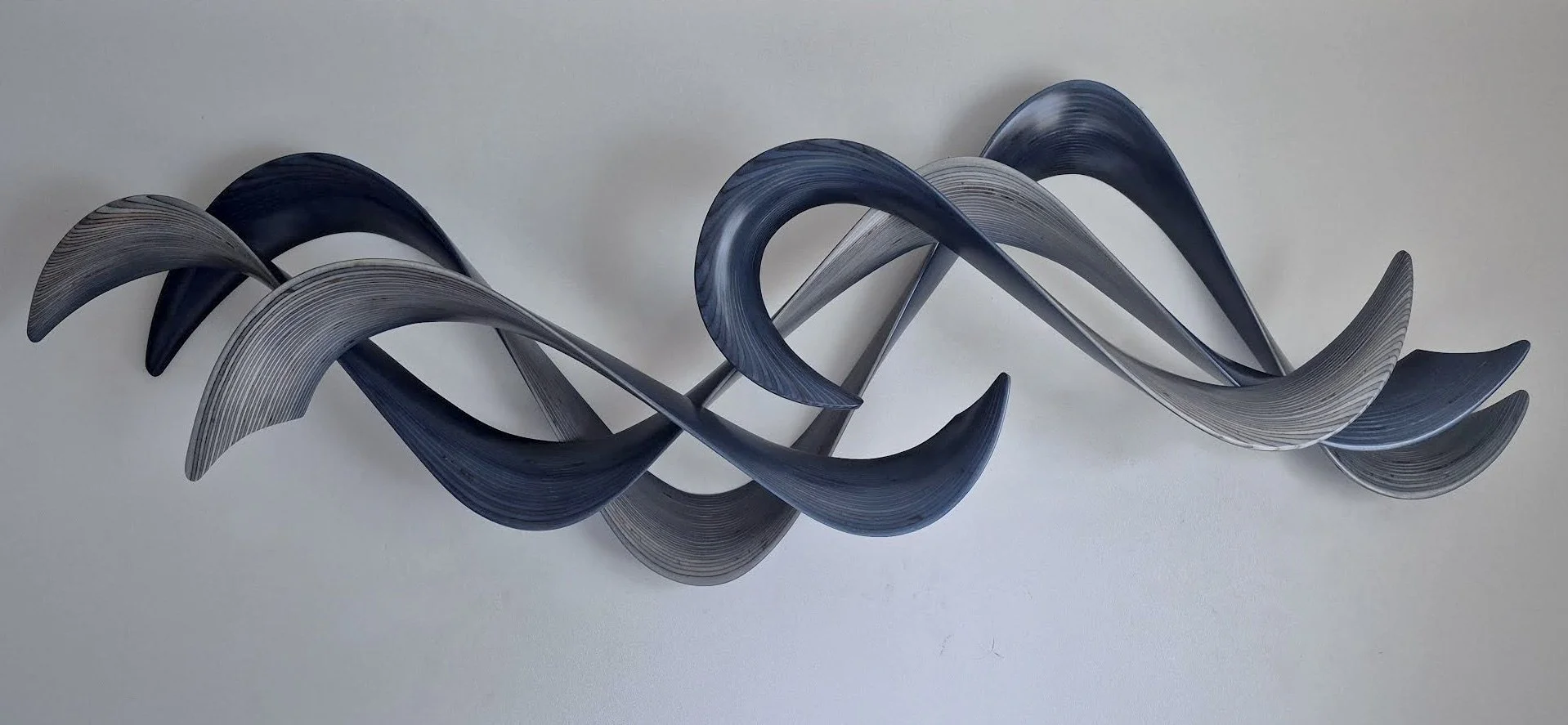 A wall-mounted, abstract sculpture resembling a wavy, flowing ribbon with blue and gray tones, casting a shadow on a white wall.
