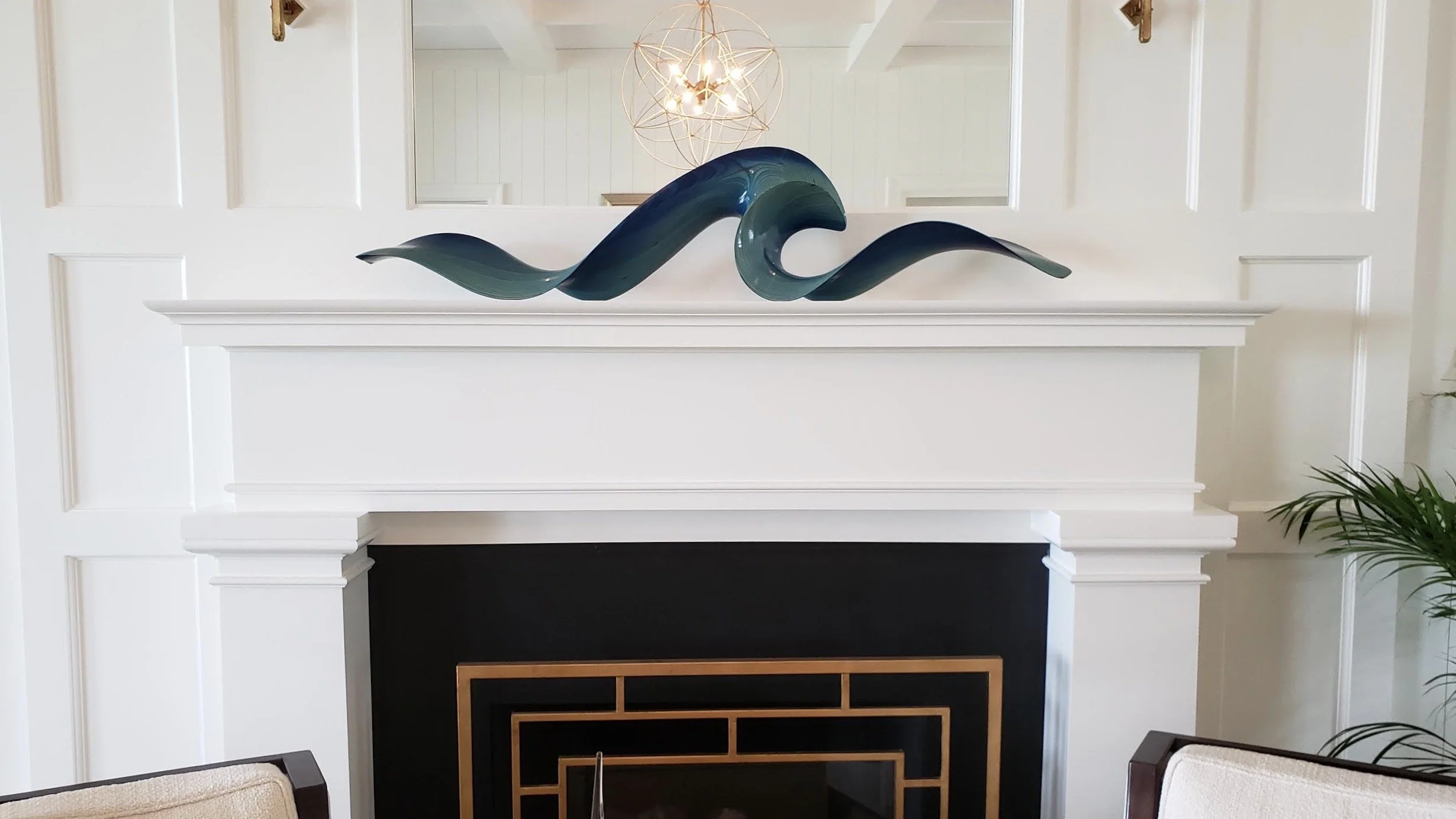 Decorative glass sculpture on a white fireplace mantel in a bright living room