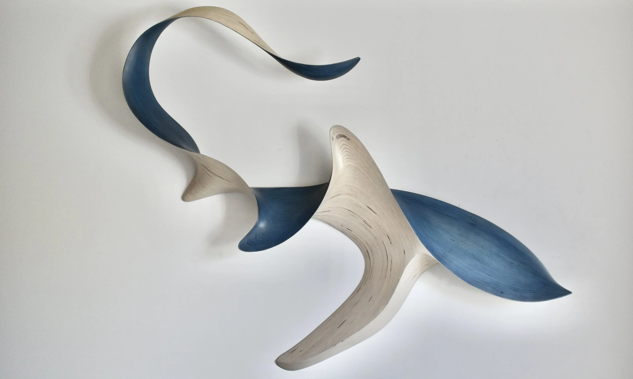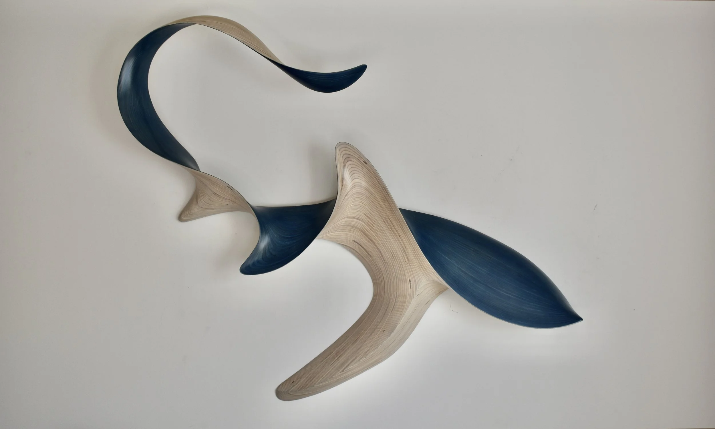 Abstract art sculpture with curved forms, blue and beige colors, with wood grain texture patterns.