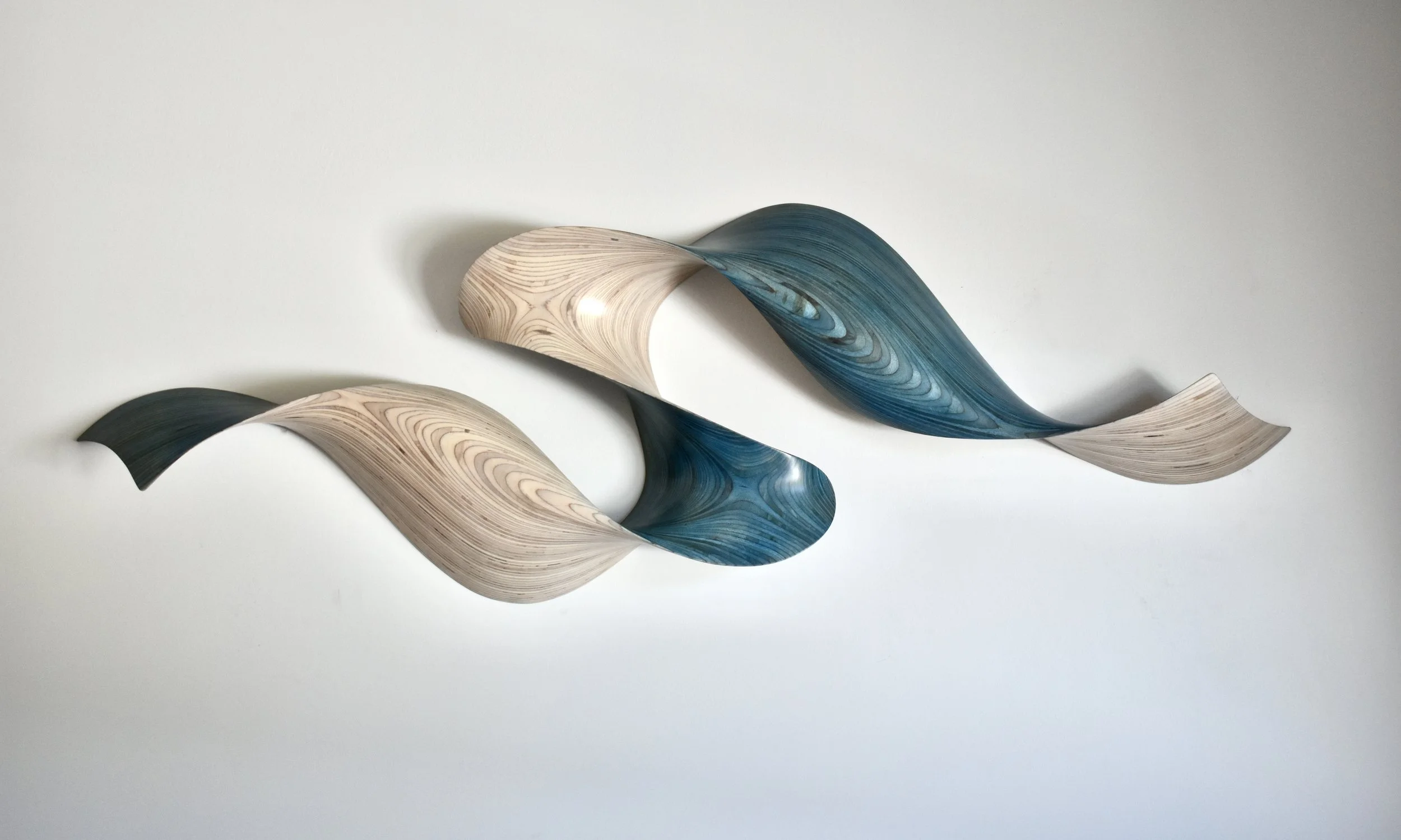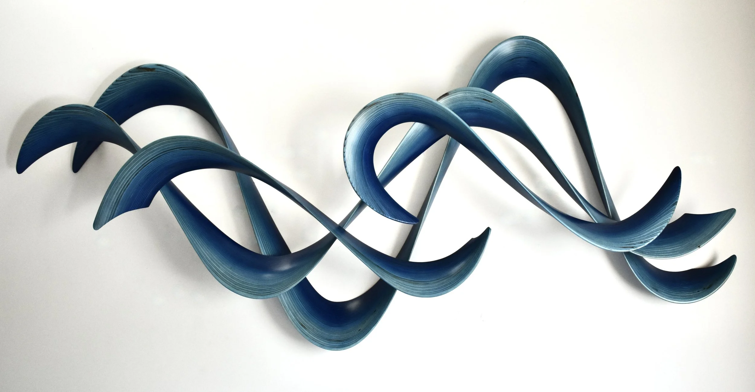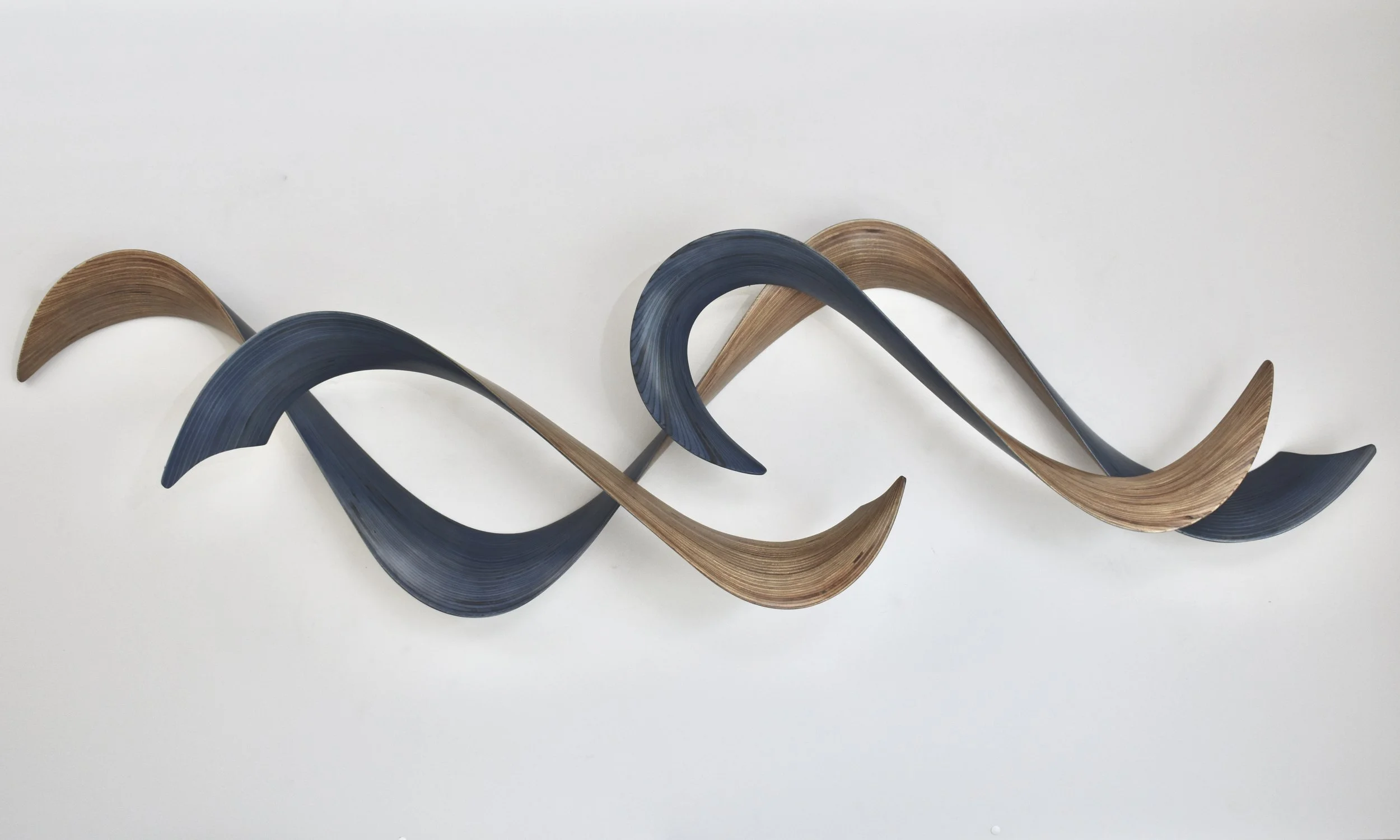 Wall sculpture with a fluid, ribbon-like shape, featuring alternating blue and natural wood-colored sections with wood grain patterns.