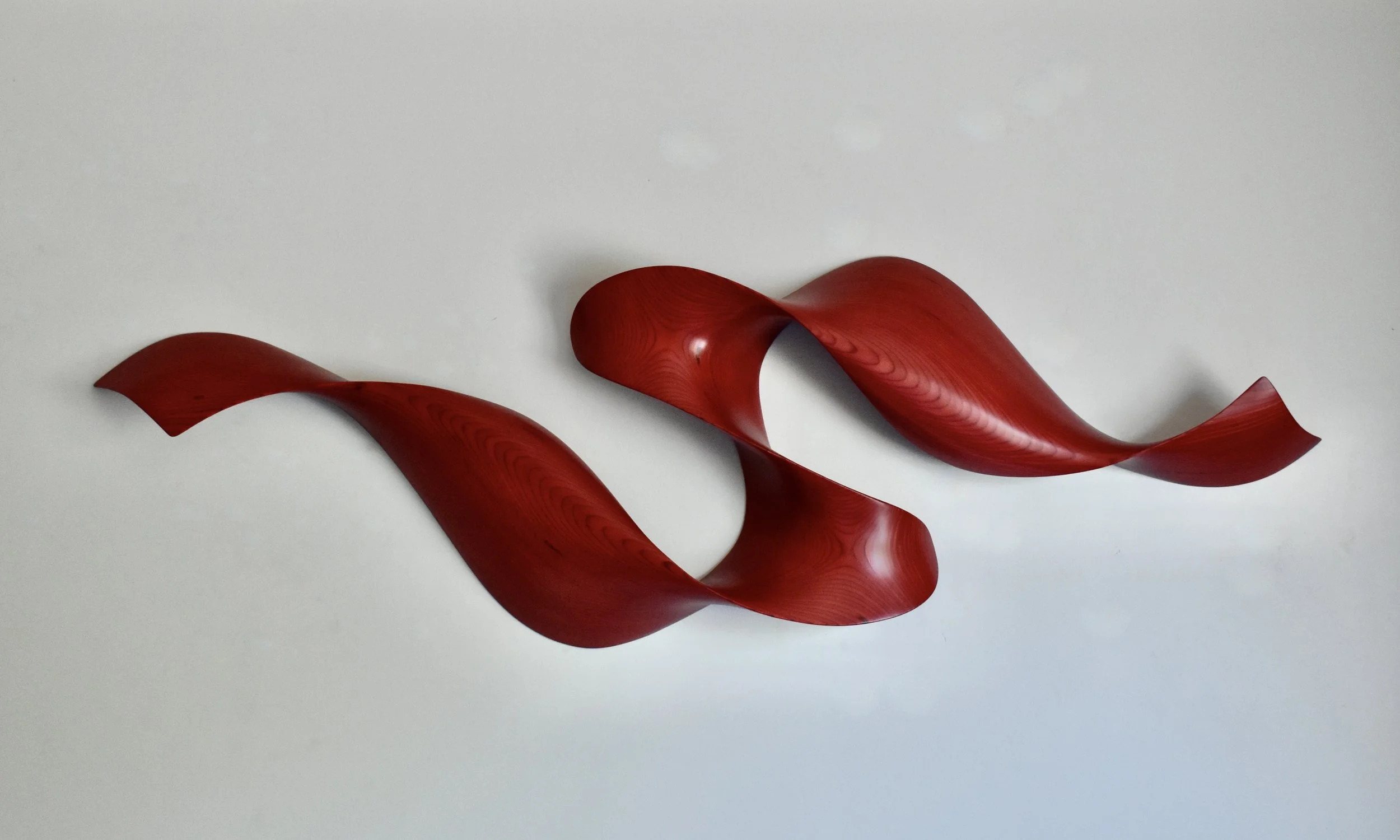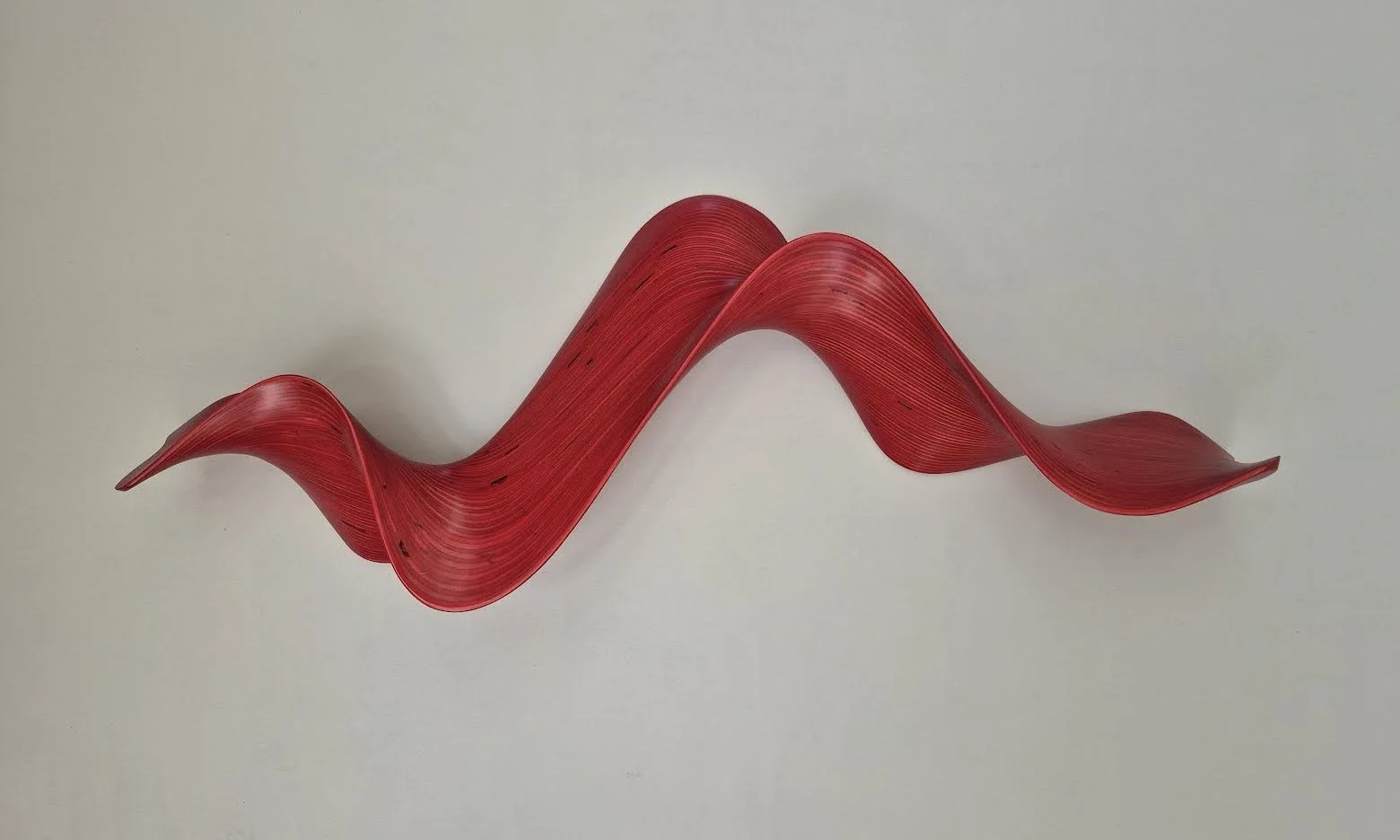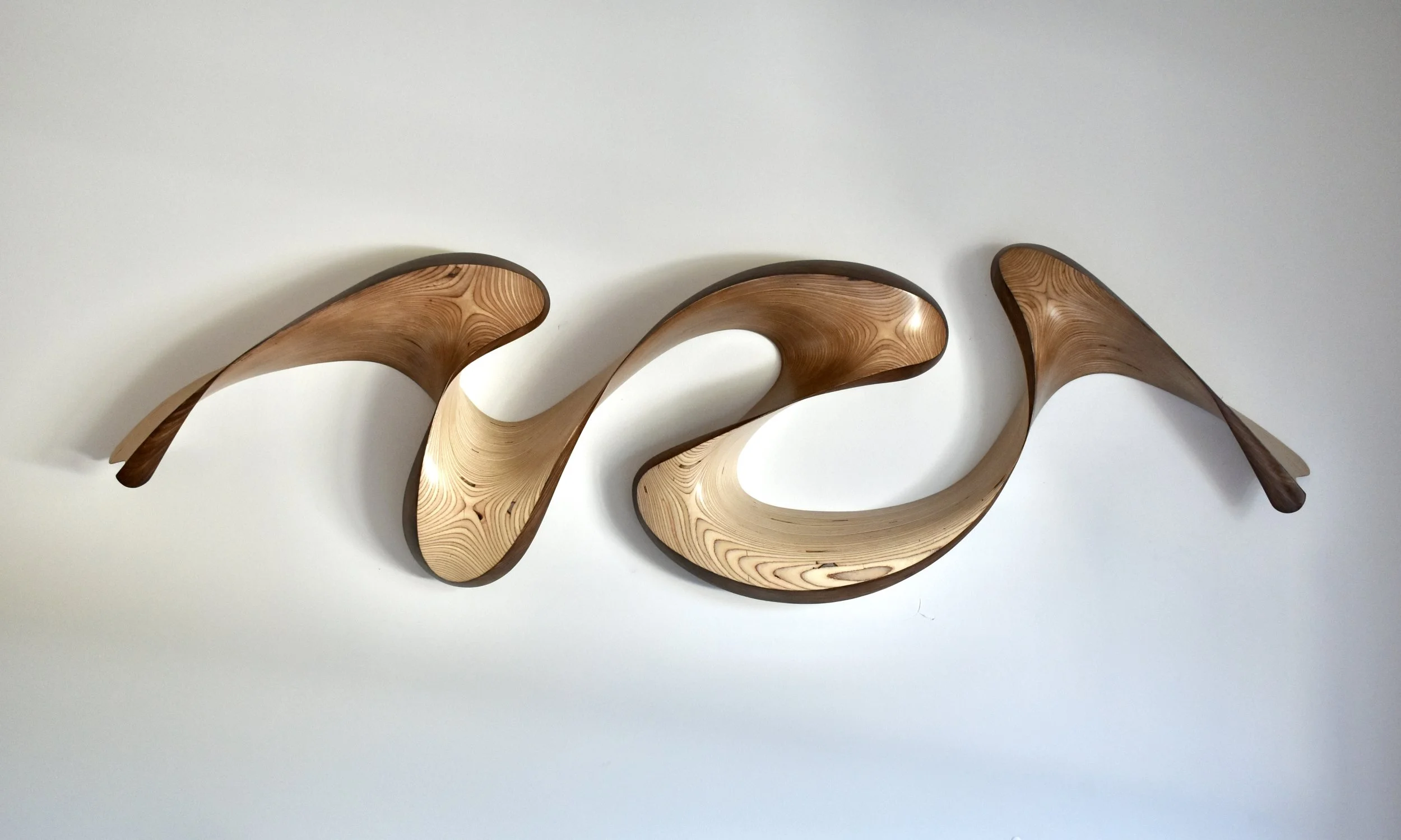 A modern, abstract wall sculpture made of layered, curved wood that resembles flowing ribbon or waves.