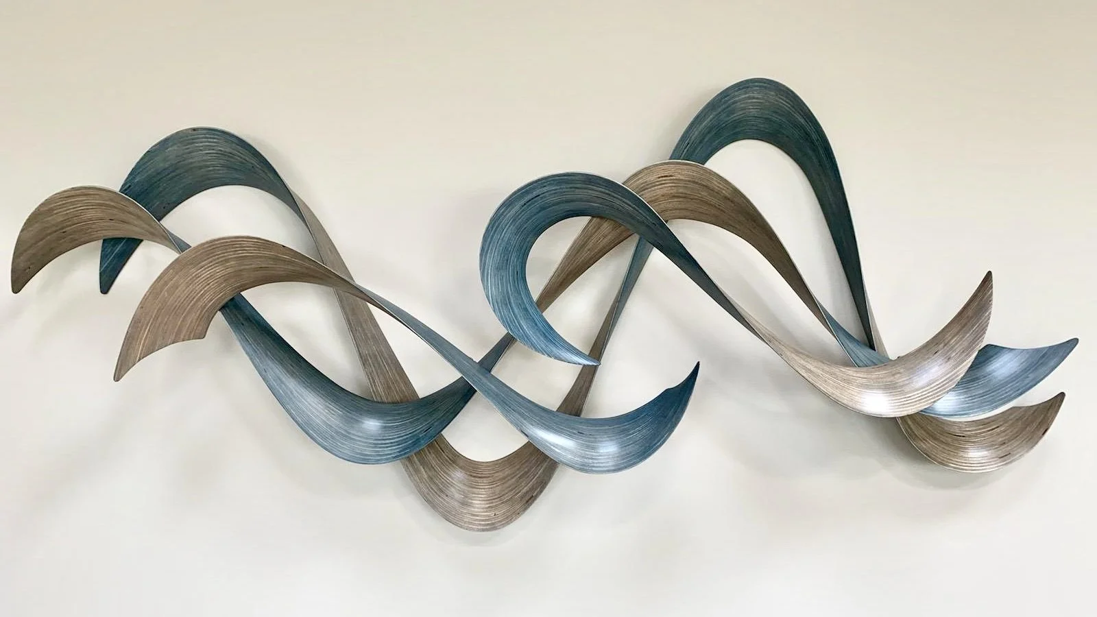 Modern wall art sculpture resembling flowing waves with wood grain and blue marbled textures.