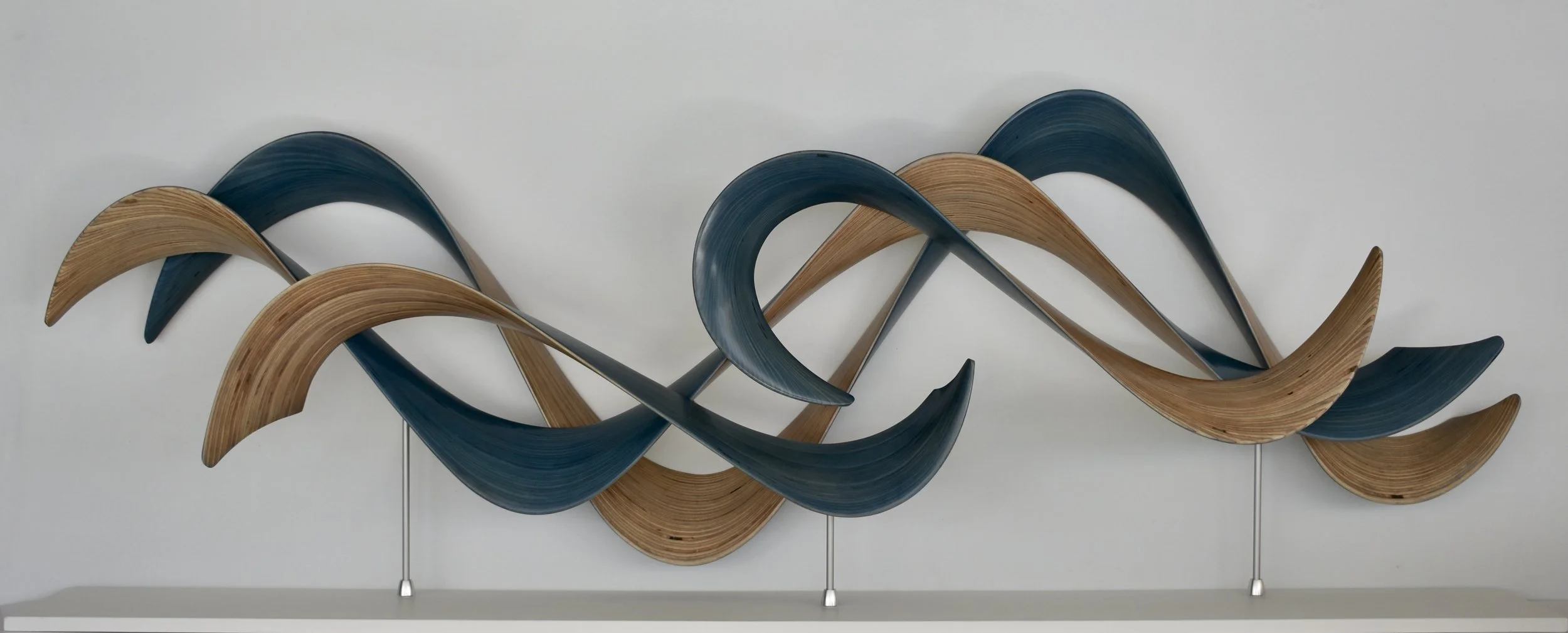 A modern, abstract wall sculpture made of curved wooden and blue painted metal elements arranged in a flowing, wave-like pattern.